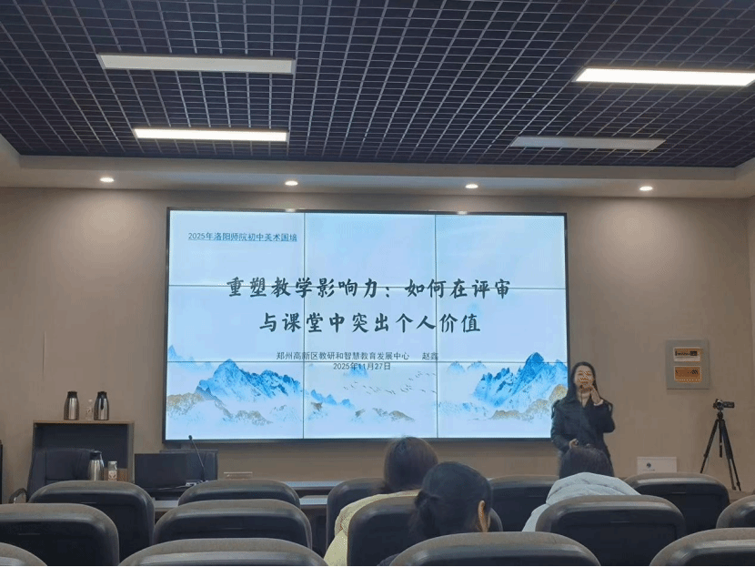 2025年11月27日上午,洛阳师范学院美术与艺术设计学院2025“国培计划”农村骨干教师能力提升培训(市级骨干教师项目)进入第八天。学术报告厅A111内掌声阵阵,郑州高新区美术书法教研室中小学高级教师赵鑫,以“重塑教学影响力:如何在评审与课堂中突出个人价值”为题,带来精彩专题分享。
