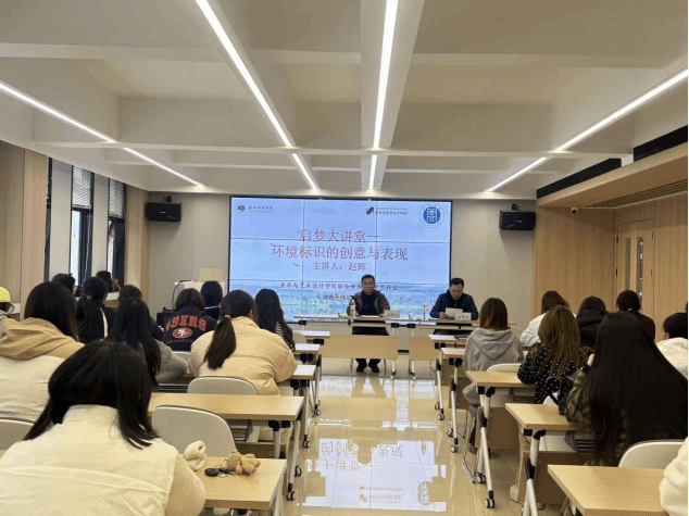 讲座中,赵辉结合自身多年深耕标识设计与照明工程领域的实践经验,从环境标识的创意构思、文化融入、技术实现等多个维度展开分享。他通过大量经典案例,生动解析了不同场景下标识设计的核心逻辑,既有城市公共空间标识的系统性设计思路,也有文旅场景中标识与地域文化的融合技巧,为学生们呈现了一堂兼具专业性与实用性的设计课。互动环节中,赵辉耐心解答学生关于设计创作、行业发展等方面的疑问,进一步激发了同学们的专业热情。