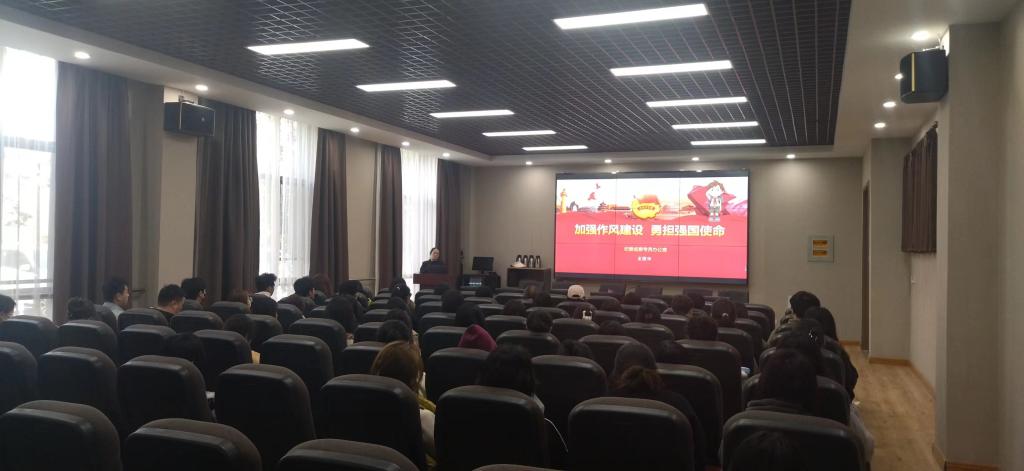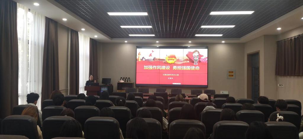 会议伊始,王丽华老师主要以“为什么要加强作风建设”“大学生存在的作风问题”“如何加强作风建设”“做一名作风过硬的优秀大学生”四个方面展开讲述。他谈到,强国使命,未来领航是大学生担负的时代使命要求,并通过历史性,现实性和发展性三个方面来阐释为什么要加强作风建设。接着,她用一些生动简明的事例来说明大学生存在的现实问题,例如小官僚问题、功利化问题、庸俗化问题,并从家庭、社会、管理制度、教育引导等方面对原因进行讲解。最后,王老师希望大家做一个仰望星空的人,做一个勇于担当的人,做一个能吃苦的人,做一个甘于奉献的人。
