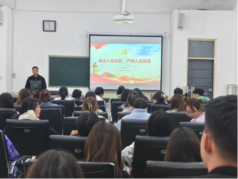 2023年10月20日晚上,我院全体积极分子在美术与艺术设计学院多媒体 B404 上“端正入党动机,严格入党程序”专题党课,本次党课由我院团委副书记宋蒙蒙讲授,全体入党积极分子认真聆听。