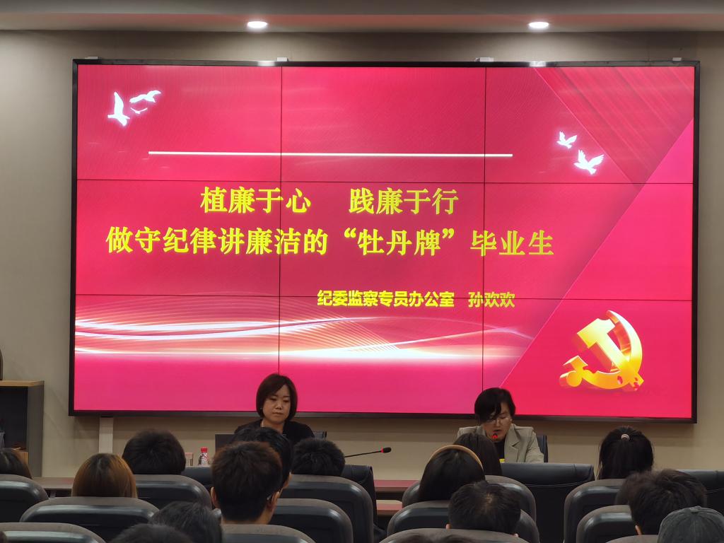 孙欢欢通过“从党的正风反腐历史看全面从严治党新形势”“党的纪律规矩和国家法律法规”和“做守纪律讲廉洁的‘牡丹牌’毕业生”三部分为2023届毕业生上了一堂发人深省、内涵丰富的廉政党课,为毕业生离开校园走上工作岗位、树立正确的人生观提供了强有力的理论与现实指导。