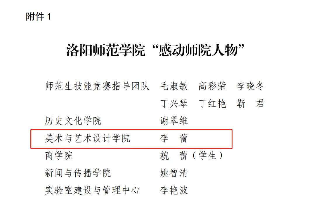 近日,根据《关于开展第十届“感动师院人物”和“十佳文明教工”评选工作的通知》精神,经基本单位推荐、校精神文明建设领导小组酝酿、校党委研究,评选出“感动师院人物”数名,我院优秀教师李蕾入选。