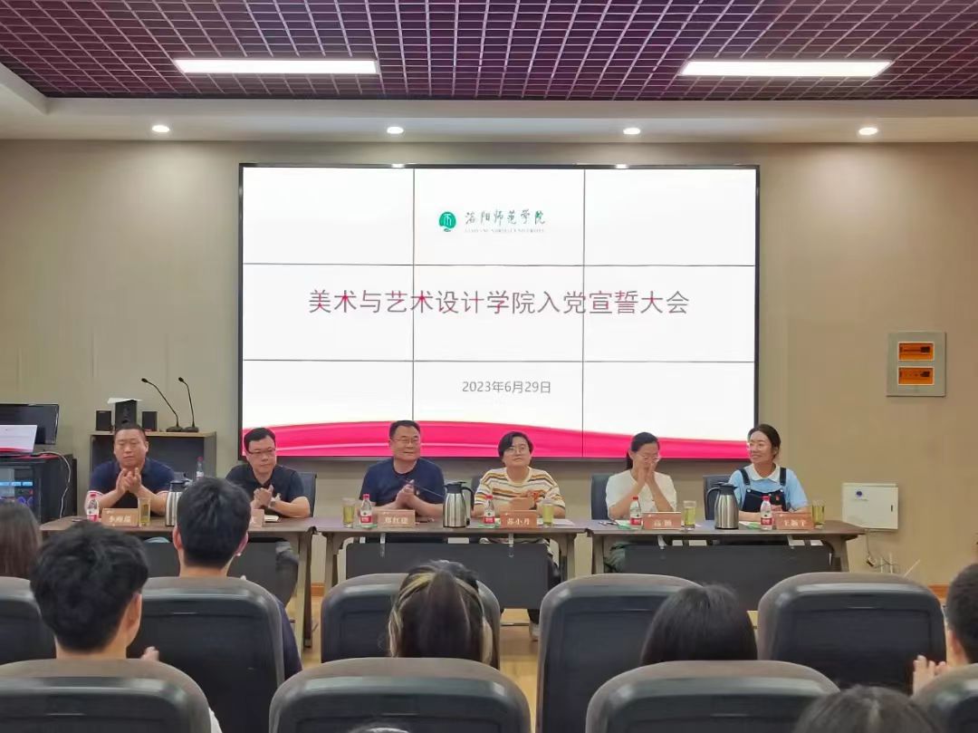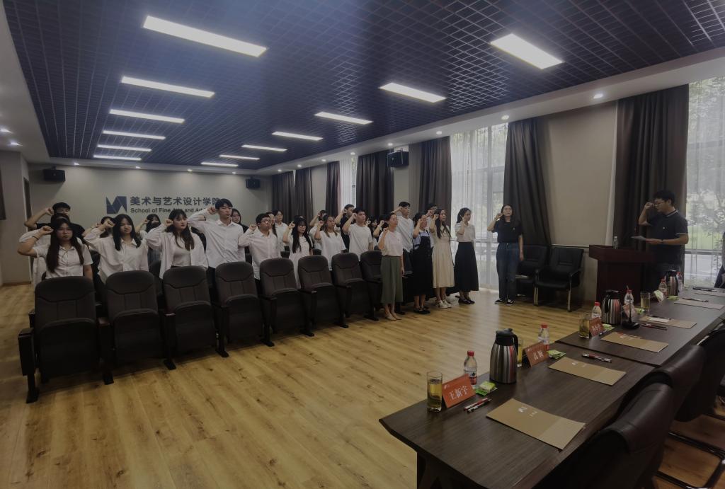 为推动学习贯彻习近平新时代中国特色社会主义思想主题教育走深走实,教育新发展党员增强党员意识、党性意识,引导全体党员凝聚起推进“一个中心两项攻坚三大行动”的磅礴力量。2023年6月29日下午,美术与艺术设计学院党委于A111会议室召开2023年度入党宣誓大会。参加本次宣誓仪式的领导、老师有我院党委书记郑红建,副书记苏小丹,副院长吴民庆,学院支部书记代表以及部分新老师生党员代表。