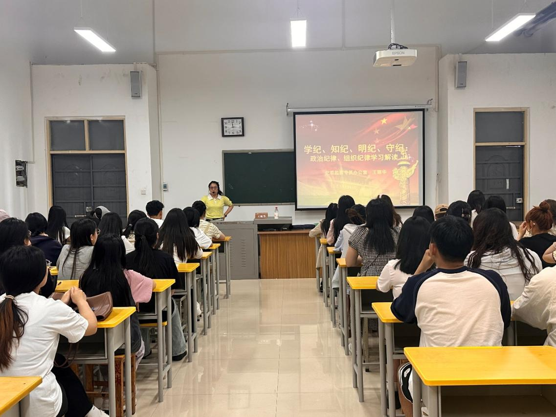 2024年5月10日,我院邀请校纪委监察专员办公室第二监察办公室主任王丽华在B404教室为学生第三党支部、学生第六党支部做“学纪、知纪、明纪、守纪:政治纪律、组织纪律学习解读”专题党课。