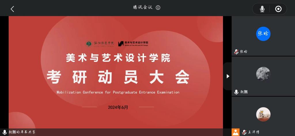 为充分调动学生的考研积极性,帮助学生了解考研形势,明确考研目标,增强考研信心,6月28日,我院通过线上腾讯会议的方式召开2021级考研动员大会,美术与艺术设计学院副院长贺朝无主讲,学院2021级全体同学参加。