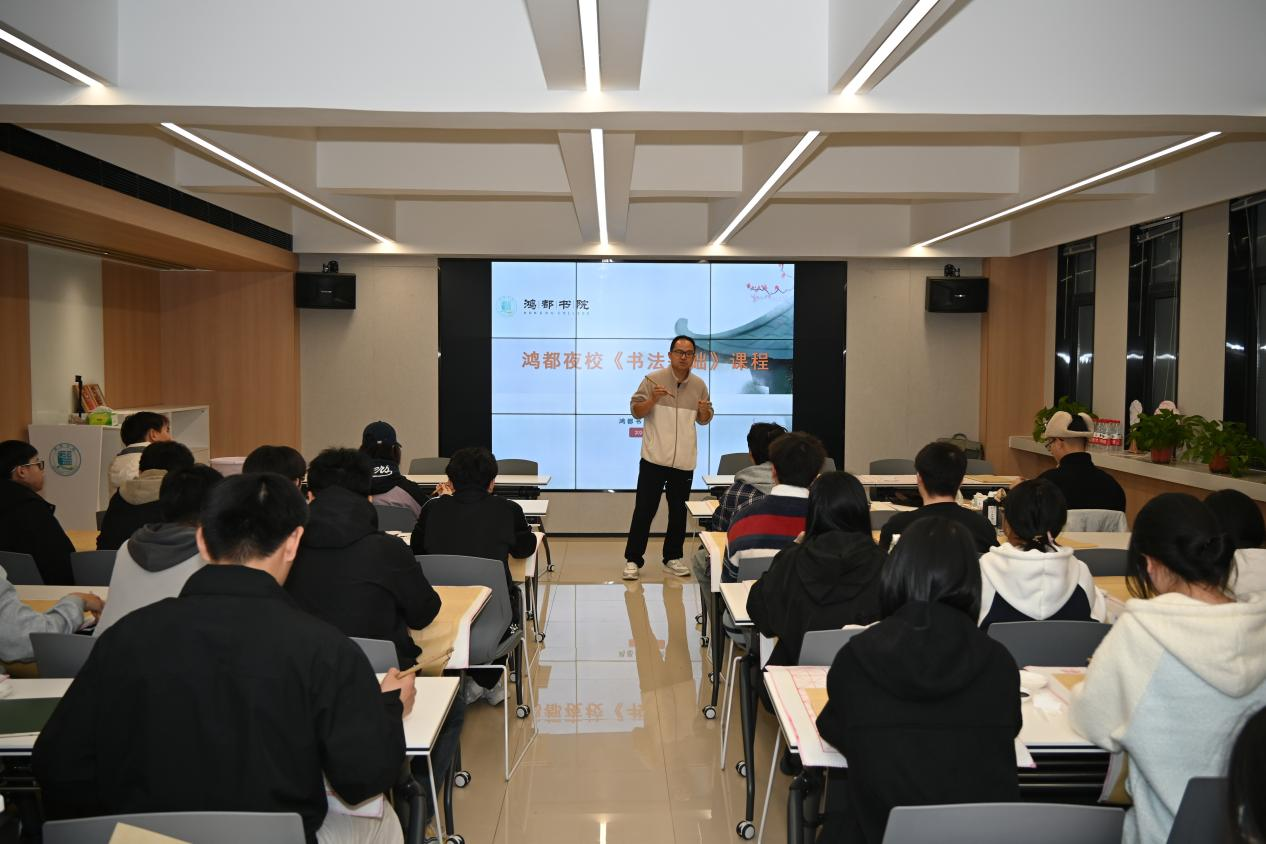 为了营造浓厚的书院育人文化氛围,调动书院学生学习积极性,帮助学生合理规划和利用课余时间,11月6日晚7:00,鸿都书院2号学生社区在润心学堂举办了鸿都夜校第一期“翰墨飘香”书法体验活动。活动邀请了美术与艺术设计学院岳精典老师主讲《书法基础》课程,鸿都书院二号院翰墨书法社以及自主报名学生共50人参加了本次活动。