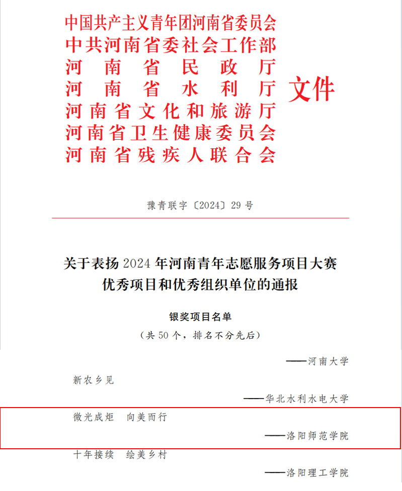 近日,2024年河南青年志愿服务项目大赛决赛成绩揭晓。我院“微火成炬 向美而行”——“洛小美”志愿服务项目以新颖的实施方式和长远的社会效益荣获大赛银奖。