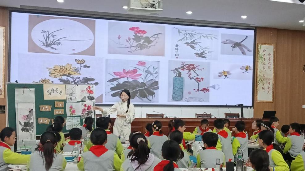 参观校园过程中,王艳辉详细介绍了多元化的美术工作室建设及丰富的美术社团活动,以及校园美育精神的发展趋势,拓展了师生对美术教育教学实践的视野。在课堂观摩环节中,侯海霞以独特的教学风格,引导学生探索中国画的深邃内涵,她组织大家分享自己的作品并展开互评。学生们在观摩与探究过程中感触良多,纷纷将自己的所见所闻记录下来。