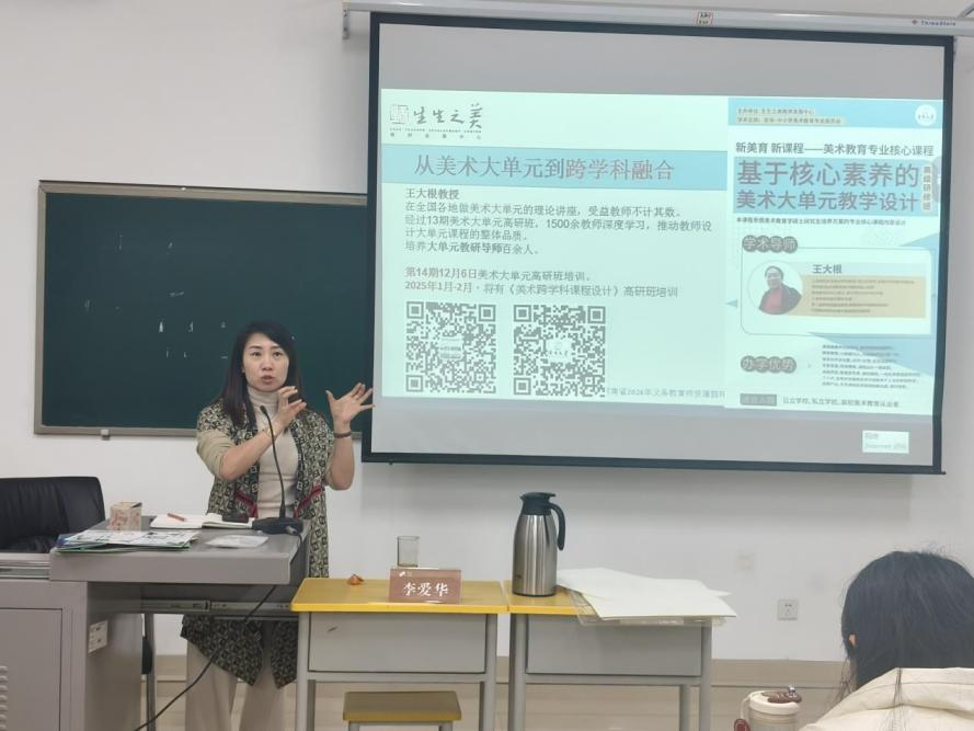 李爱华以“如何创建一个引人入胜的选题”展开本次授课。她指导大家分组,开展小组分析与讨论,以促进大家互动与知识交流。随后,李爱华邀请各小组代表上台汇报讨论成果,逐步引导大家的逻辑思维,并通过实践深化学生对美术跨学科课程内容的理解与掌握。最后,她强调,在美术教学中将不同学科知识串联学习,能帮助学生更好地理解和运用美术知识,同时,在教学过程中,教师应关注学生的兴趣和需求,运用多种教学策略,激发学生的学习积极性。
