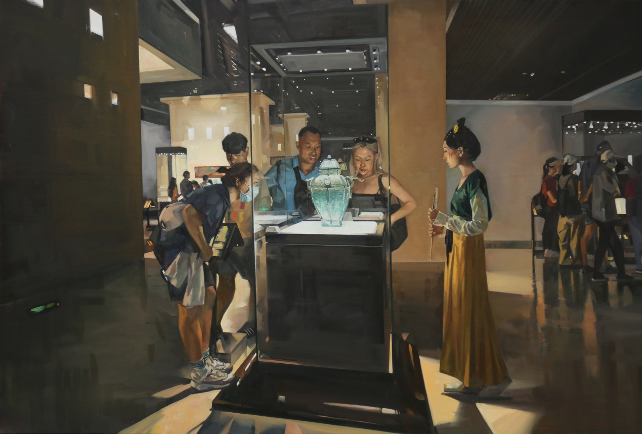油画作品《文化之旅》以洛阳博物馆为创作灵感来源,反映当前普通市民的日常生活。该作品通过场景解构以及描写不同角色的社会人物,以具象写实的绘画手法展现出中华民族的文化底蕴与民族精神。