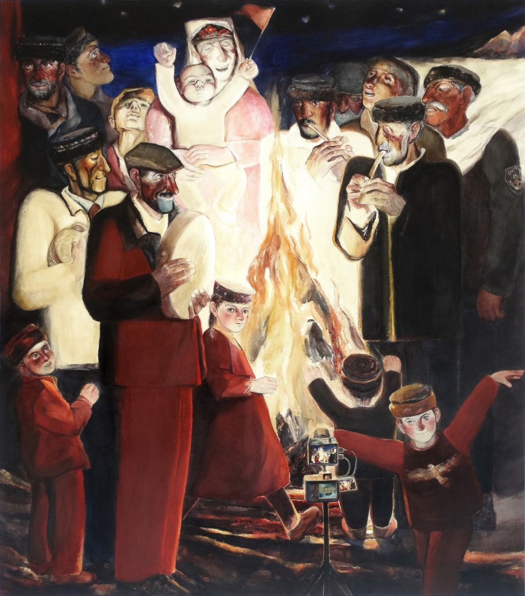 水彩作品《高原之夜》是以古丝绸之路为契合点、以帕米尔高原的人文精神家园为主题,表现乡村振兴、“一带一路”大背景之下塔吉克民族生活状态的作品。作品以强烈的“十”字形光感统摄画面,通过对画面的整体性把握和人物的精神性表达,集中展现了勤劳勇敢的塔吉克人们生生不息、安居乐业、积极向上、热爱祖国、守望美好家园的生活场景,表现了新时代背景下塔吉克民族文化和旅游融合发展的大好局面。
