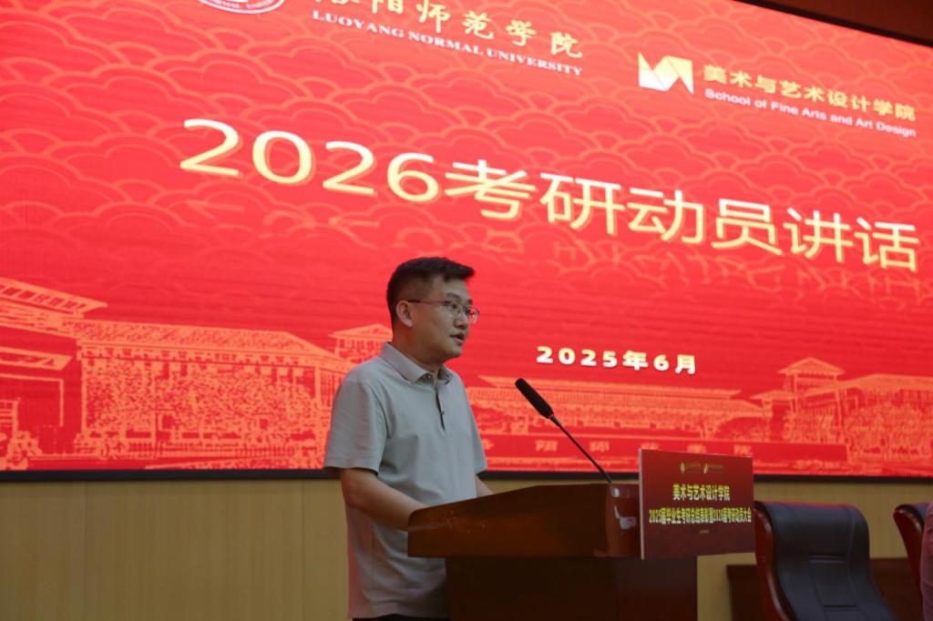 苟彬在 2026 届考研动员讲话中,对备考学子提出四点期望:一是志存高远,将个人艺术理想融入国家文化强国战略;二是科学规划,构建系统化、高效率的复习体系;三是坚韧不拔,以顽强毅力攻克备考过程中的重重难关;四是协同聚力,充分利用学院提供的资源和师长的指导帮扶。他特别强调,学院永远是同学们最坚实的后盾!掷地有声的承诺点燃了全场学子的备考斗志。