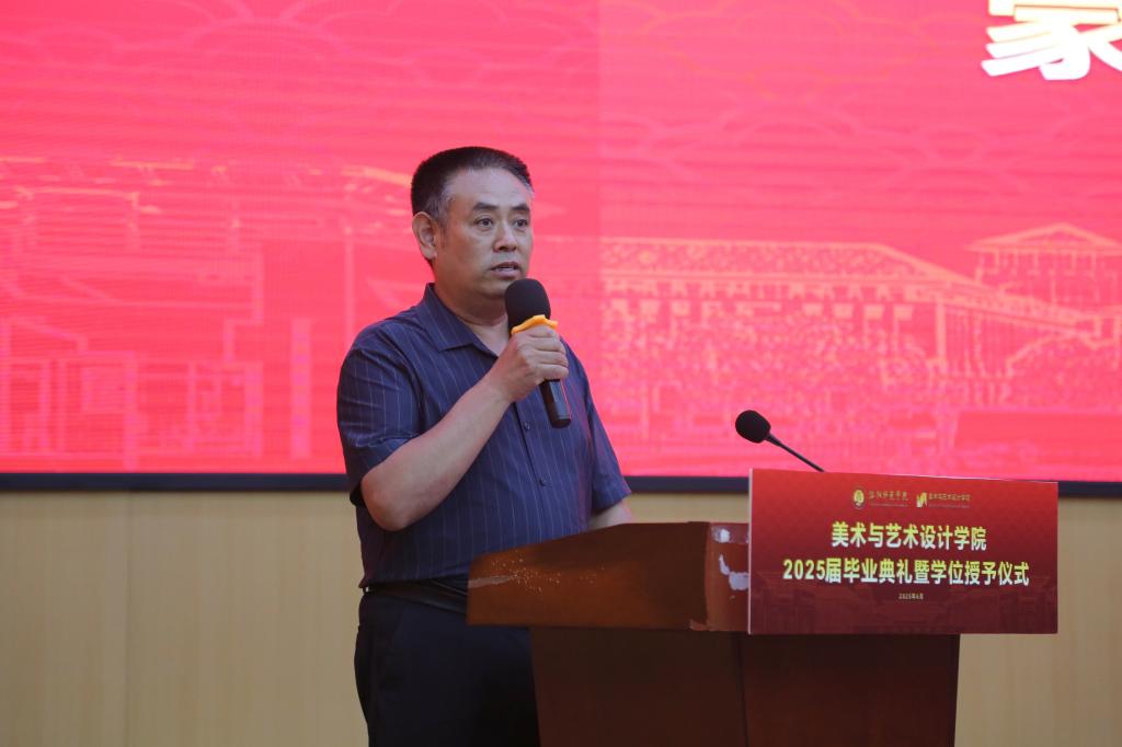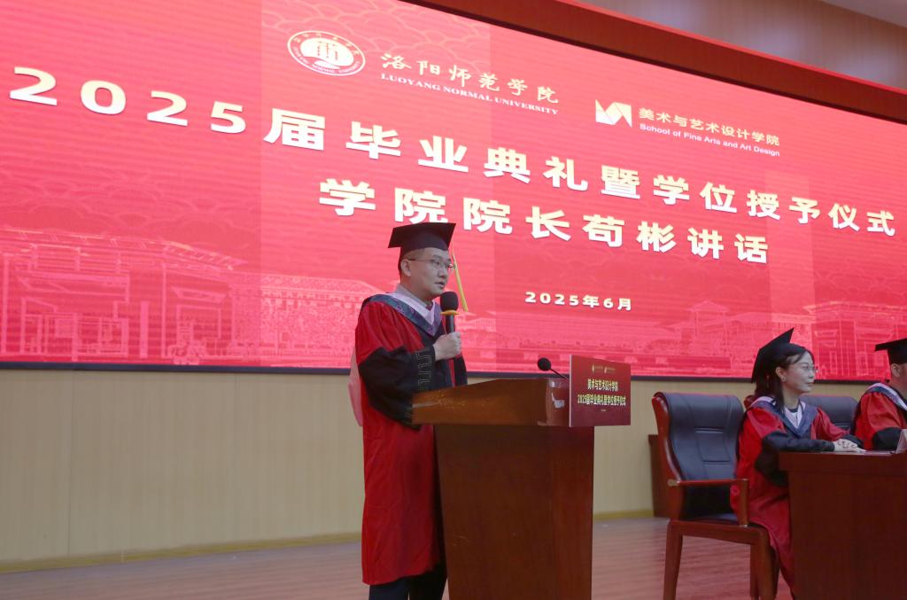 苟彬对2025届毕业生顺利完成学业表示热烈祝贺,并对毕业生提出四点期望,希望大家坚守艺术初心,保持对艺术的热爱与执着;其次,勇于创新突破,不断拓展艺术的边界;第三,肩负社会责任,用艺术服务社会;最后,保持终身学习,不断提升自己的素养和能力。他满怀深情地说:“执手临别,让我们把千言万语归结成美好的祝愿,衷心祝愿你们吹响逐梦的号角,扬起前行的船帆,去新的征程砥砺奋斗,在新的天地建功立业,铸就于国有功、于校有荣、于己有彩的壮丽人生!”