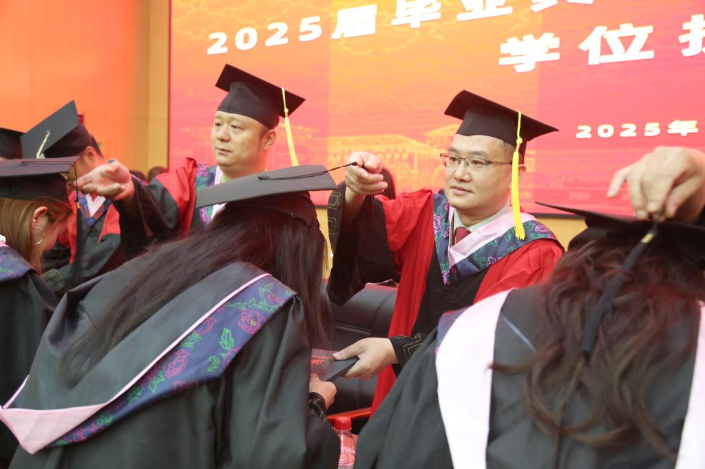 伴随着庄严的国歌声,学院2025届毕业典礼暨学位授予仪式拉开帷幕。副院长贺朝无宣读了《关于表彰2025届优秀毕业生的决定》;院长苟彬宣读了《关于授予2025届毕业生学士学位的决定》。学院学位委员会全体委员为受表彰的优秀毕业生代表颁发荣誉证书并为全体毕业生正冠拨苏。