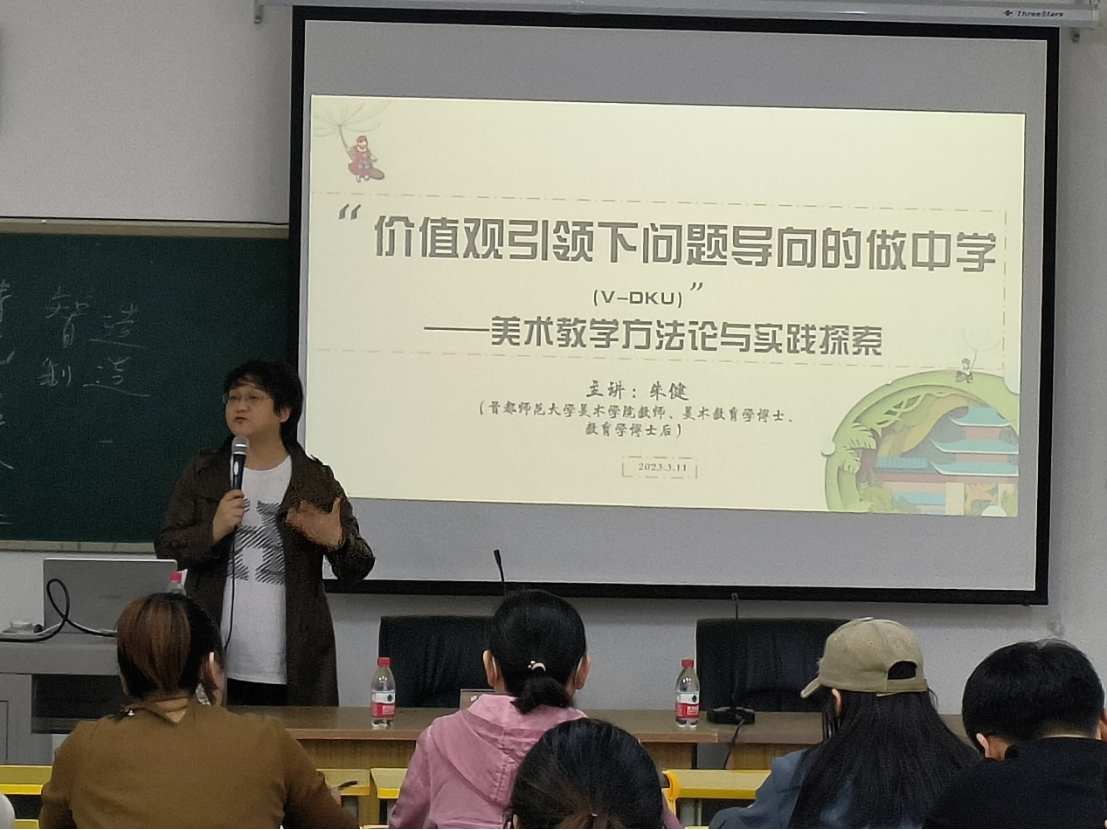 2023年3月11日上午,我院特别邀请首都师范大学美术学院的朱健副教授开展题为“价值观引领下问题导向的做中学V-DKU——美术教学方法论与实践探索”的讲座。本次讲座由我院邓冲老师主持,100多名师生积极参加。