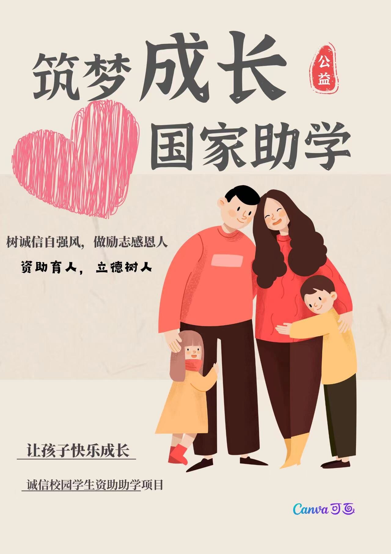 国家助学贷款是国家利用金融手段完善我国普通高校资助政策体系,加大对普通高校贫困家庭学生资助力度所采取的一项重大措施。借款学生可以通过学校向银行申请贷款,毕业后分期偿还。然而,在目前的社会中,有一些学生不仅利用国家助学贷款做违背良心的事情,而且还没有在规定的时间内归还资金。这样,他们就会形成很差的信用度,以后无论是在银行办信用卡还是贷款买房等都会受到阻碍。而在信用至上的今天,一旦丧失了诚信,我们就有可能会在社会上面失去很多机会,最后寸步难行。诚信并不仅仅关乎我们大学生,它关乎到这个社会中的每一份子。因此,加强诚信教育对个人、社会和国家的发展有极其重要的意义;我们也应自绝讲诚守信,利用好助学贷款与国家资助金,增强就业和服务社会的能力。本作品以“筑梦成长,国家助学”为主标题,采用一家四口温馨相拥的形象,附和“让孩子快乐成长”的目的。“树诚信自强风,做励志感恩人。”