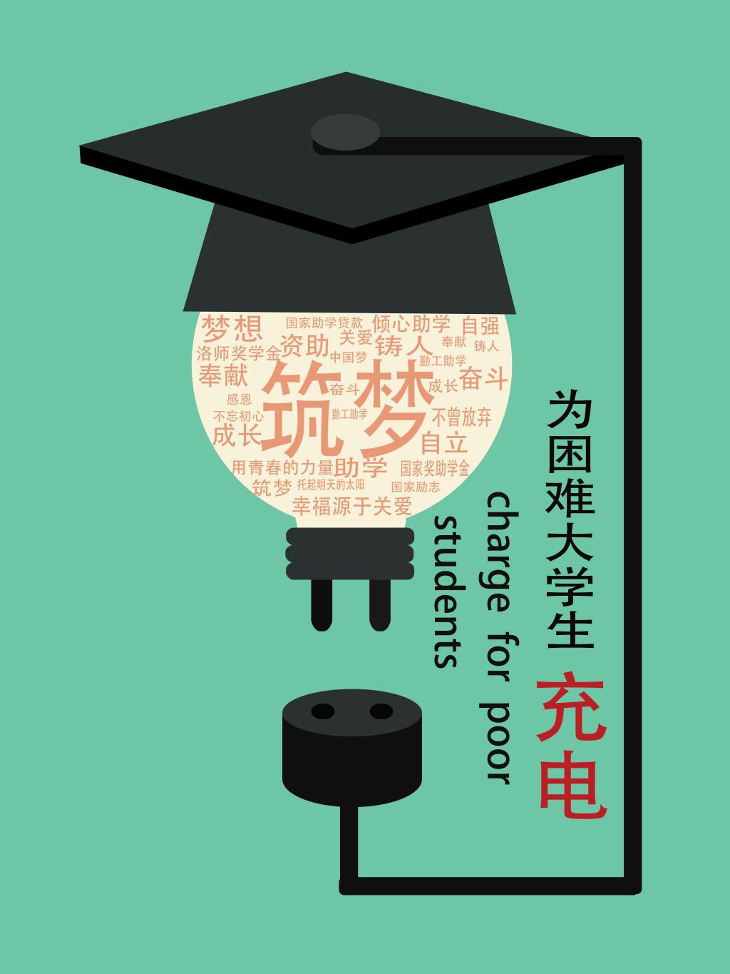 3.寓意:图片背景以绿色为主绿色代表着成长和希望,黄色灯光代表着温暖和鼓励,代表着对贫困大学生的爱和关心,灯光上的学士帽代表着关心,以及对大学生的支持和关爱,帮助大学生有一个更好的前途和美好的未来。对现实生活的残酷无情,党和国家的家庭经济困难学生资助政策体系无异于雪中送炭,为她们解决燃煤之急,及时充电,助大学生启梦-远航。