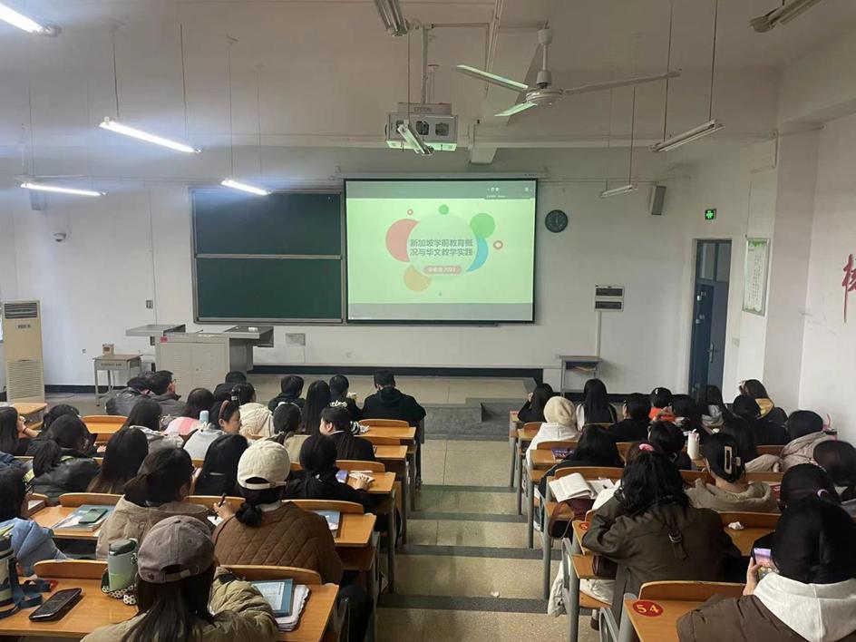11月23日下午,基于《学前比较教育》课程安排需要,学前教育学院、问礼书院二号院在A7-114教室和A7-115教室开展“名师进课堂”活动,新加坡Agape Little Uni.分园副园长张俊楠老师受邀为全体2020级同学分享《新加坡学前教育概况与华文教育实践》,活动现场由王姣莉、陈梦滢两位老师主持。本次讲座采用线上线下相结合模式,学院学生积极参与。