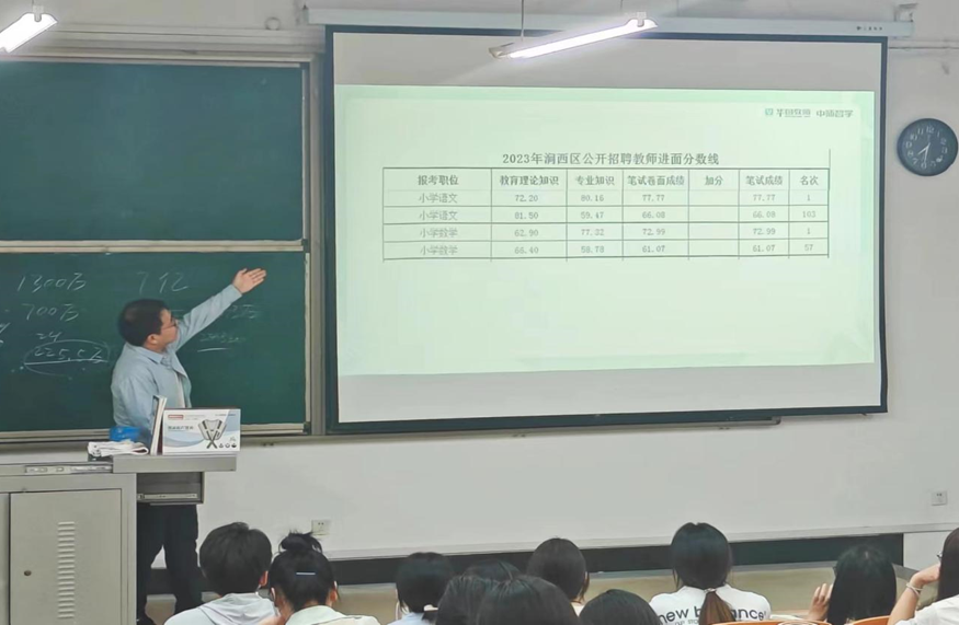 4月18日,我院在A7-114教室召开2024年河南招教特岗备考讲座,邀请中师华图培训师王继辉担任主讲人,我院毕业班及其他年级部分学生参加讲座。