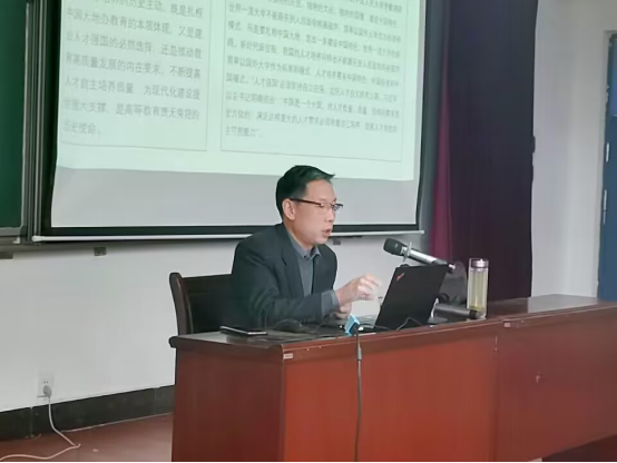 张运礼从深刻领悟开辟马克思主义中国化时代化新境界,深刻领会新时代新征程中国共产党的使命任务,深刻领会党的二十大赋予教育科技人才的重大使命,深刻领悟团结奋斗在中国决战决胜疫情的生动实践,深刻领悟团结奋斗让青春绽放绚丽之花的精神力量等五大方面展开论述。他着重强调通过教育、科技、人才进行“三位一体”是全面建设社会主义现代化国家的基础性,战略性支撑。因此同学们要坚定理想信念,志存高远,脚踏实地,勇做时代的弄潮儿为建设社会主义现代化国家打下坚实基础。围绕同学们密切关注的新学期学习问题,他分享了三点心得体会:一是要砥砺实干、勇于担当,不驰于空想、不骛于虚声,踏踏实实将蓝图着笔于实践;二是要锤炼过硬本领,在学习中丰富知识、锻炼品格,将所学所思与实践相结合;三是要养成良好的学习习惯,避开诱惑,拒绝“躺平”,摆脱“摸鱼”“划水”的消极心态。课程尾声,他表示2023年是全面贯彻落实党的二十大精神的开局之年,也是我们每个人重整行装、铆足干劲、加油努力之年,同学们作为新时代的开拓者要勇于走在时代前列,以实际行动书写新的人生篇章。