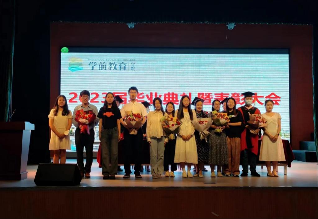 首先,副院长靳君介绍了学前教育学院2023届毕业生毕业情况,副院长杜燕红宣读对2023届毕业生“考研学习标兵”和“就业之星”的表彰决定,学院领导为受表彰的个人进行了颁奖。院长马锦华作毕业致辞,她从家国情怀到个人品行,从责任使命到未来发展,言辞恳切,情意深长,饱含着对毕业生的希冀。毕业生代表王一凡发表毕业感言,感谢四年来领导的关怀,老师的教导,同学的鼓励。在校生代表洪清路对顺利完成学业的学长学姐们表示热烈的祝福和衷心的祝愿,希望他们万事顺意、前程似锦,用青春和汗水书写无愧于自己的青春之歌。班主任代表、教师代表王翠萍为毕业生送来了毕业祝福,她希望他们不忘母校,谨遵老师教诲,锐意进取,再创辉煌。毕业生为班主任和辅导员献花,彰显了对恩师的感谢。