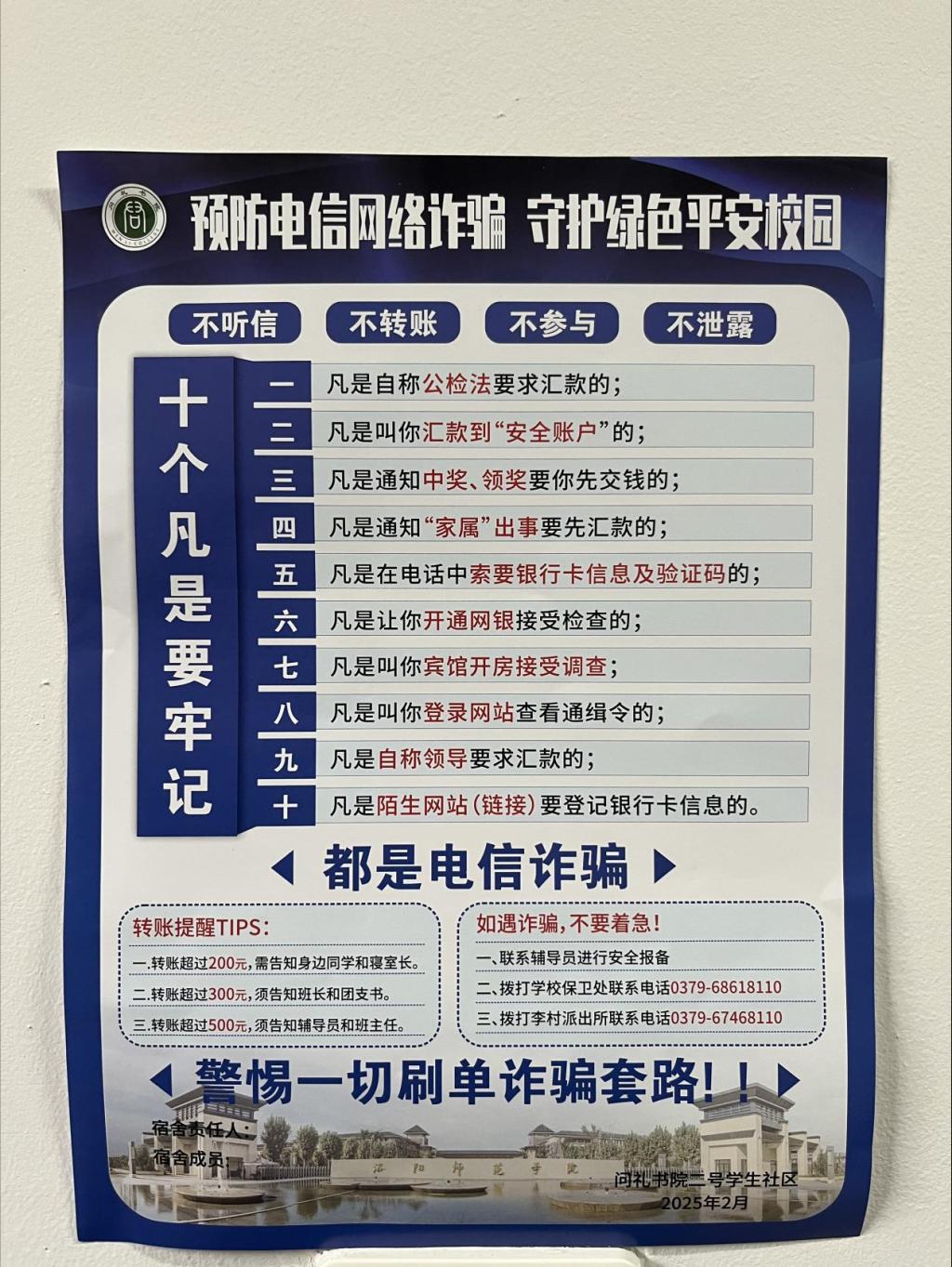 为保证防诈骗教育切实有效,书院专门制作了“预防电信网络诈骗,守护绿色平安校园”宣传单,各楼长、层长深入各个寝室细致讲解宣传单内容,提醒同学们牢记“十个凡是”,严格落实转账报备要求,警惕一切刷单诈骗套路,做到全员覆盖、全员参与。宣讲结束后,楼管会干部带领各宿舍责任人和宿舍成员签署承诺书并张贴至各宿舍,时刻提醒同学们牢记防诈骗注意事项,宿舍责任人持续做好提醒监督工作,切实筑牢安全防线。