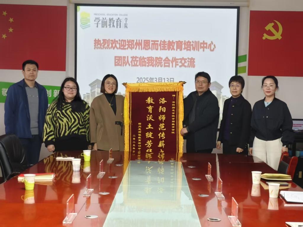 3月13日下午,郑州恩而佳教育培训中心执行校长刘丹丹一行专程来到学前教育学院,将绣有 “洛阳师范传薪火 教育沃土绽芳华”的锦旗郑重赠予学院,对我院持续输送高素质毕业生表示衷心感谢。学院党委书记褚卫东等班子成员出席赠旗仪式,双方就进一步合作进行深入交流。
