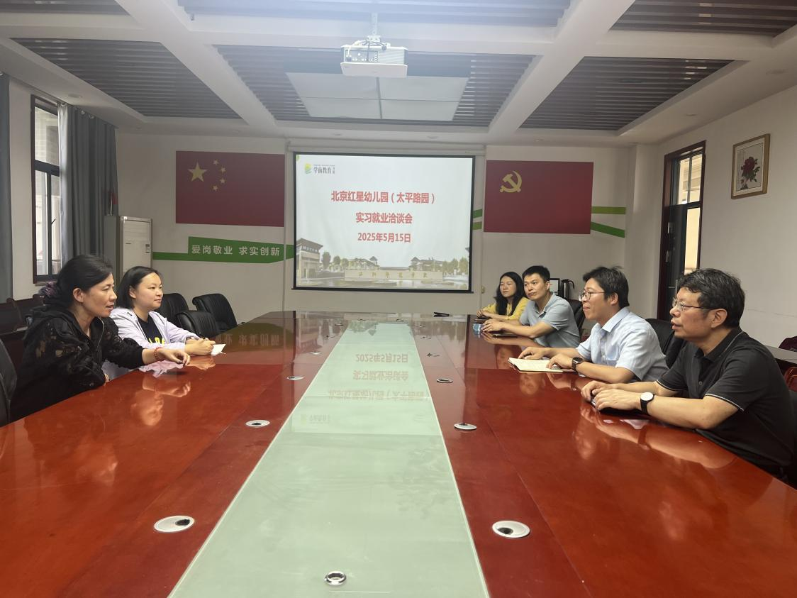 招聘会结束后,学前教育学院领导班子与北京红星幼儿园(太平路园)园长李静、副园长胡敏进行了座谈,就今后进一步加强学生实习、毕业生就业、园本教研等合作意向进行了深入交流。