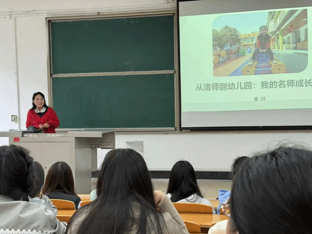 金川以“从洛师到幼儿园:我的名师成长之旅”为主题,结合成自身长轨迹,从求学与工作两方面展开分享。求学阶段,她详述我校专业课程、见习实践及恩师指导对筑牢基础、树立幼教理想的关键作用,勉励新生夯实理论、积极实践;工作阶段,她结合一线经验,分享“理论落地”与特色教育方法的探索心得,以鲜活案例阐释“以幼儿为本”理念,强调爱心、耐心与专业智慧的重要性,为新生提供了清晰的职业成长指引。