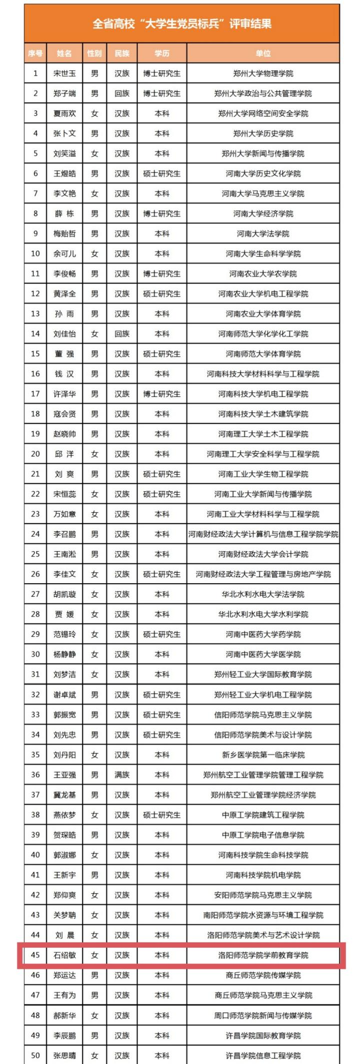 近日,河南省教育厅公布2022年全省高校“大学生党员标兵”评审结果。我院2019级学前教育专业的石绍敏荣获“大学生党员标兵”称号。