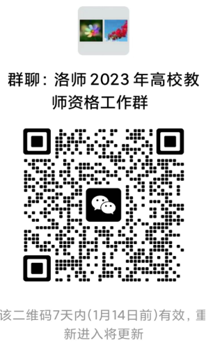 各单位要做好宣传,将考试时间和方式通知本单位相关人员。参训教师务必扫描下方二维码加入洛师2023年高校教师资格工作微信群(进群请注明学院、姓名、联系方式),以便于开展工作。