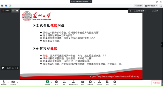 会上,两位同学从自身经历出发,结合今年研究生复试形式、要求,为大家详细讲解了线下复试的流程及注意事项。其中,赵博琳同学强调了个人简历制作需重点关注的方向、专业复试前的复习策略等问题;霍建一同学给大家分享了复试面试常见问题以及回答技巧,为大家在面试时提出了一些避坑的好思路。最后,两位毕业生和在校同学们进行了交流。