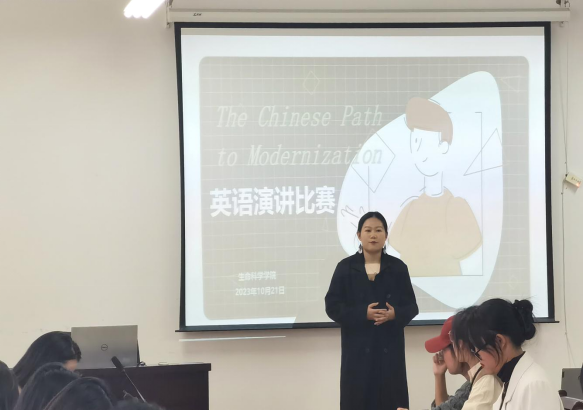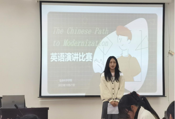 本次英语演讲比赛以"The Chinese Path to Modernization"为主题,参赛选手们结合近期历史事件、热点新闻、个人经历等,以流畅的英语声情并茂地展现自己,他们富有真情实感的演讲,在观众中引起了强烈的共鸣,赢得了观众的阵阵掌声。赛后评委对选手们的演讲进行了细致且专业的点评与指正,赛后学习部结合评委打分,推选出21级生科二班陈斯环同学、23级生科四班吕星谕参加校级比赛。