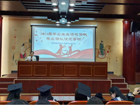 活动主要分为“毕业确认”“诚信教育”“感恩教育”三部分。通过主题宣讲、政策宣传等形式向毕业生细致讲解助学贷款的还款流程及相关规定,倡导毕业学生自觉主动还款,牢固树立诚信意识,履行还款义务,避免因未按时还贷造成逾期,导致个人信用降低影响工作、生活等,造成不良后果。同时介绍了毕业信息确认的操作方法,提醒同学们及时提交《国家开发银行国家助学贷款毕业确认表》,完成毕业确认工作。而对于需要继续贷款攻读学位的学生,详细指导他们填写续贷的申请。最后希望毕业生们要常怀感恩之心,牢记党、国家与社会的关爱,感恩母校、老师、同学,要厚植家国情怀、涵养品格,在新的领域上脚踏实地,贡献自己的力量,为中国式现代化挺膺担当。