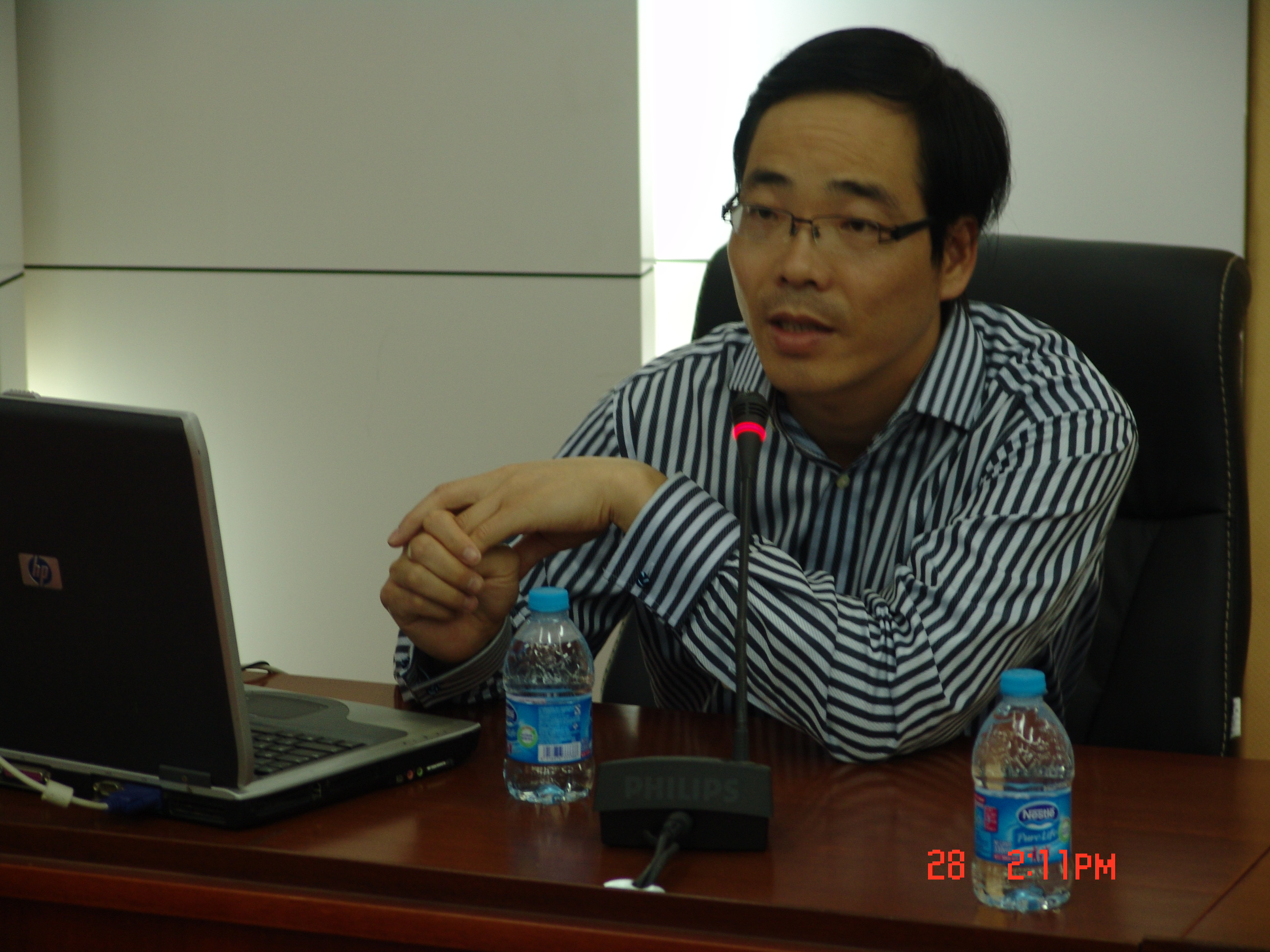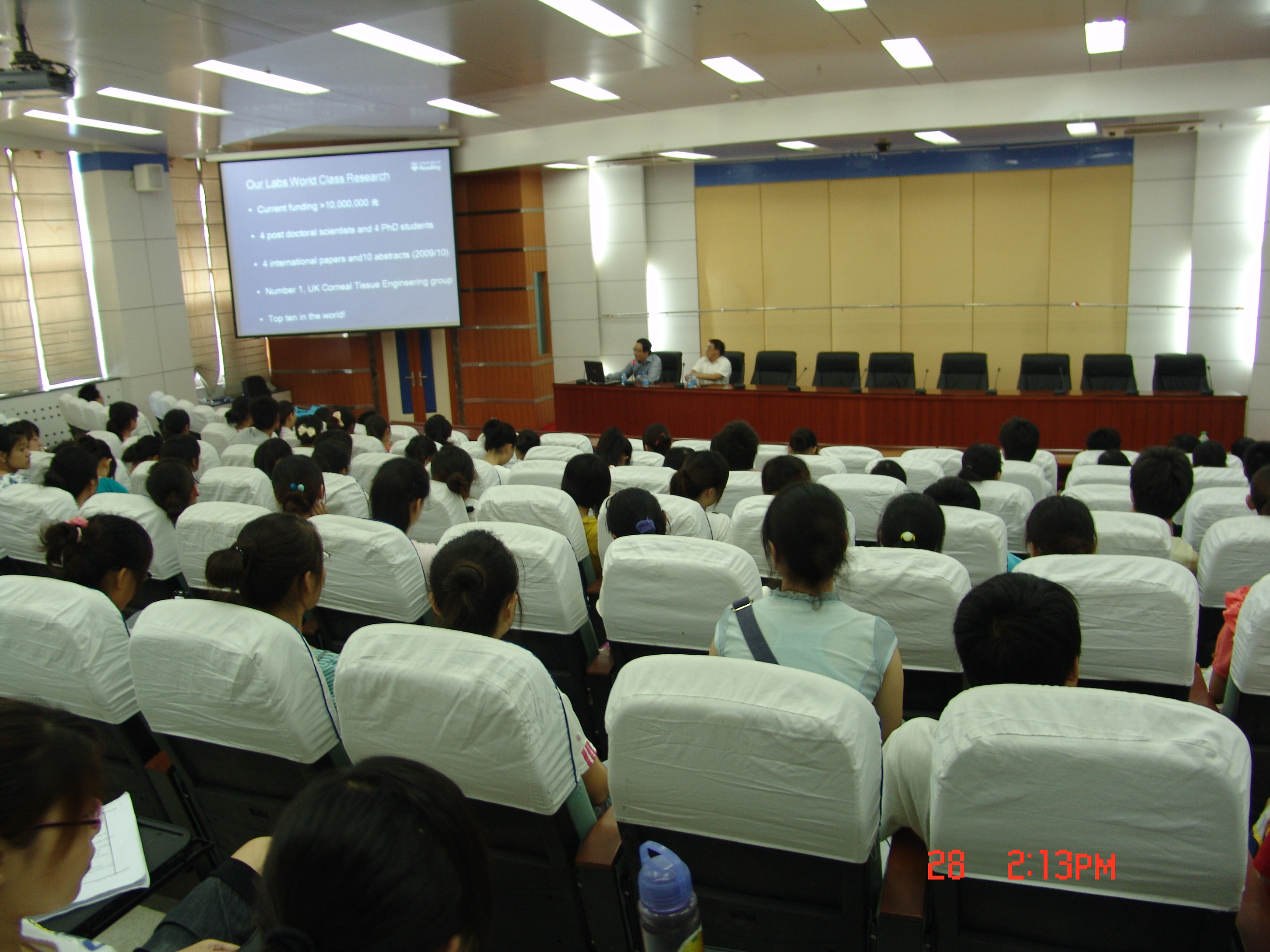 弥博士先向全体师生展示了雷丁大学角膜干细胞研究所的实验设备图片,并讲述了研究所研究员的相关情况。接着弥博士就干细胞、原位组织工程、体移植、再生医学、角膜干细胞体外扩增等问题从有关背景、研究状况以及应用前景等方面作了相关的学术报告,并简洁精要地回答了师生诸如“为什么以角膜为研究对象”、“如何在SCI上发表论文”、“生命科学的发展前景”等问题。