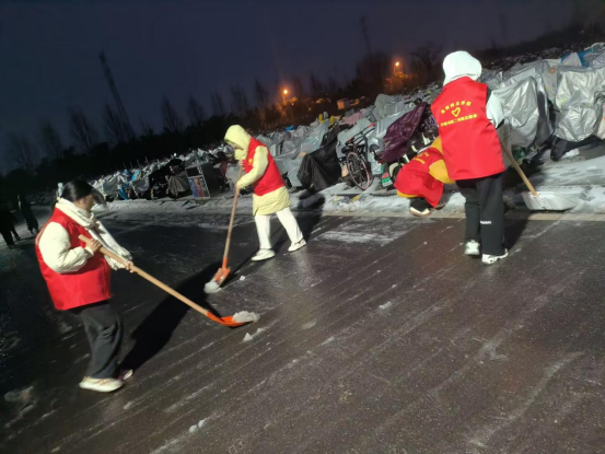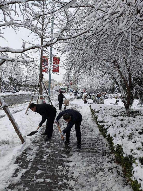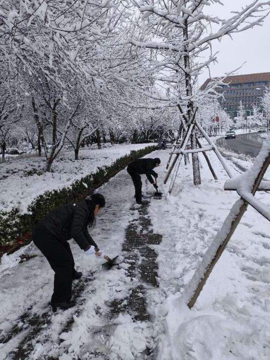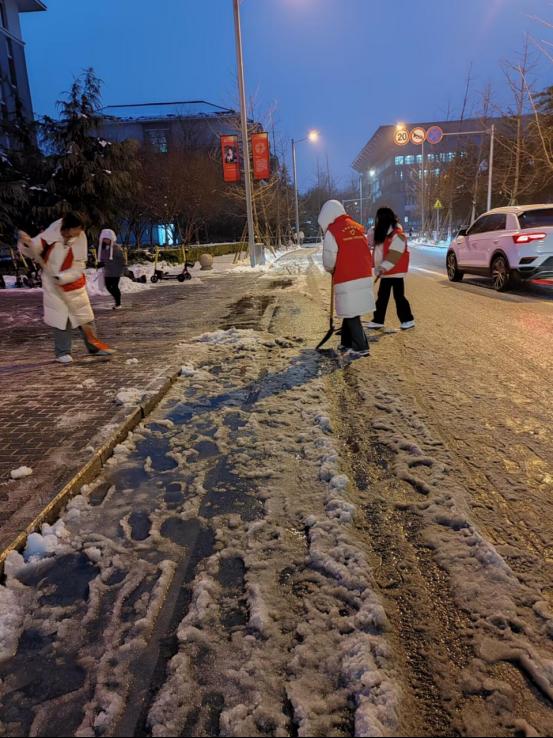在生命科学学院和开阳书院二号院楼前,志愿者们不畏严寒,拿起铁锹、扫帚等工具分工合作,清除校园道路上的积雪。经过不懈努力,相应区域道路上的积雪被清理干净,确保了师生的出行安全。