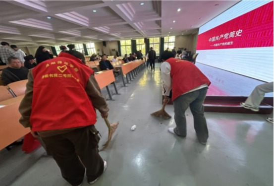 活动伊始,宣讲学生围绕“中国共产党的诞生”声情并茂地讲述了革命先辈的故事,详细阐述了中国共产党成立的历史背景和重大意义,以及党在各个历史时期如何带领人民进行艰苦卓绝的斗争,从新民主主义革命的胜利到社会主义建设的推进,再到改革开放的伟大成就,使参会人员深刻感悟到革命先辈艰苦卓绝的斗争精神和坚如磐石的革命意志。会后,学生志愿者仔细清扫会场的每个角落,用实际行动践行奉献精神。