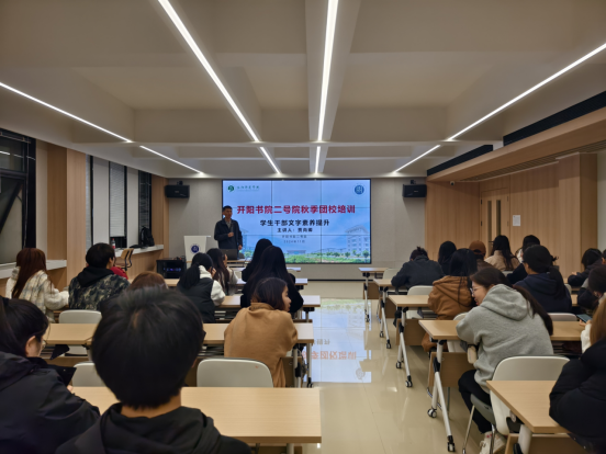 为切实加强学生干部队伍建设,提升学生干部的文字素养,增强语言表达能力,11月12日晚,开阳书院2号学生社区、生命科学学院在二楼会议室开展秋季团校培训,本次培训以学生干部文字素养提升为主题,由书院社区心理健康教育中心副主任贾尚卿担任主讲人,书院全体团委、学生会干部参加此次培训。