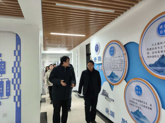 曹玉涛一行在书院社区党委书记陈冰、院长崔家田、党委副书记倪洪涛、李广的陪同下,先后参观了“一站式”学生社区的多种功能室,调研了书院社区的工作环境、基础设施、育人文化氛围建设情况以及学生日常管理服务工作。调研过程中,曹玉涛对现阶段书院育人模式的改革建设工作表示肯定,并指出书院社区应继续坚持立德树人,以学生为本,优化空间利用,增设更多功能区域与设施,以满足学生的学习与生活需求。同时,书院社区要切实做好各项服务保障工作,强化安全隐患排查,为社区师生的学习生活提供更多便利。