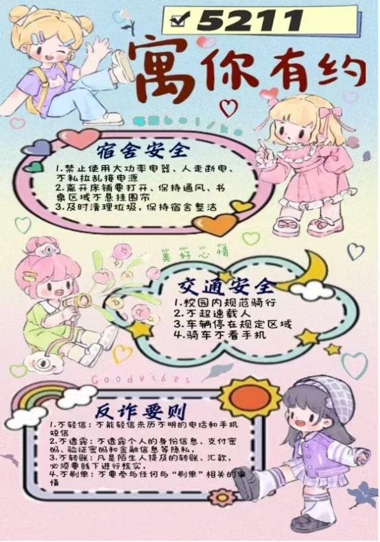 5月30日至6月6日,为加强学生宿舍安全管理,提升书院社区文明建设水平,书院社区面向全体住宿学生开展“安全文明公约”创建活动。活动内容包含多个维度,在用电安全方面,禁止使用大功率电器、人走断电、不私拉乱接电源等;在床帏管理方面,要求学生离开床铺要打开、保持通风,建议书桌区域不悬挂围帘等;在防诈骗方面,劝导学生不轻信陌生来电、不透露个人信息、不轻易给陌生人转账、不参与刷单等;在交通安全方面,要求学生校园内规范骑行、不超速载人等。本次活动旨在增强宿舍成员协作能力与自我管理意识,通过制定符合宿舍实际的安全文明行为规范,营造和谐、整洁、安全的宿舍文化氛围。