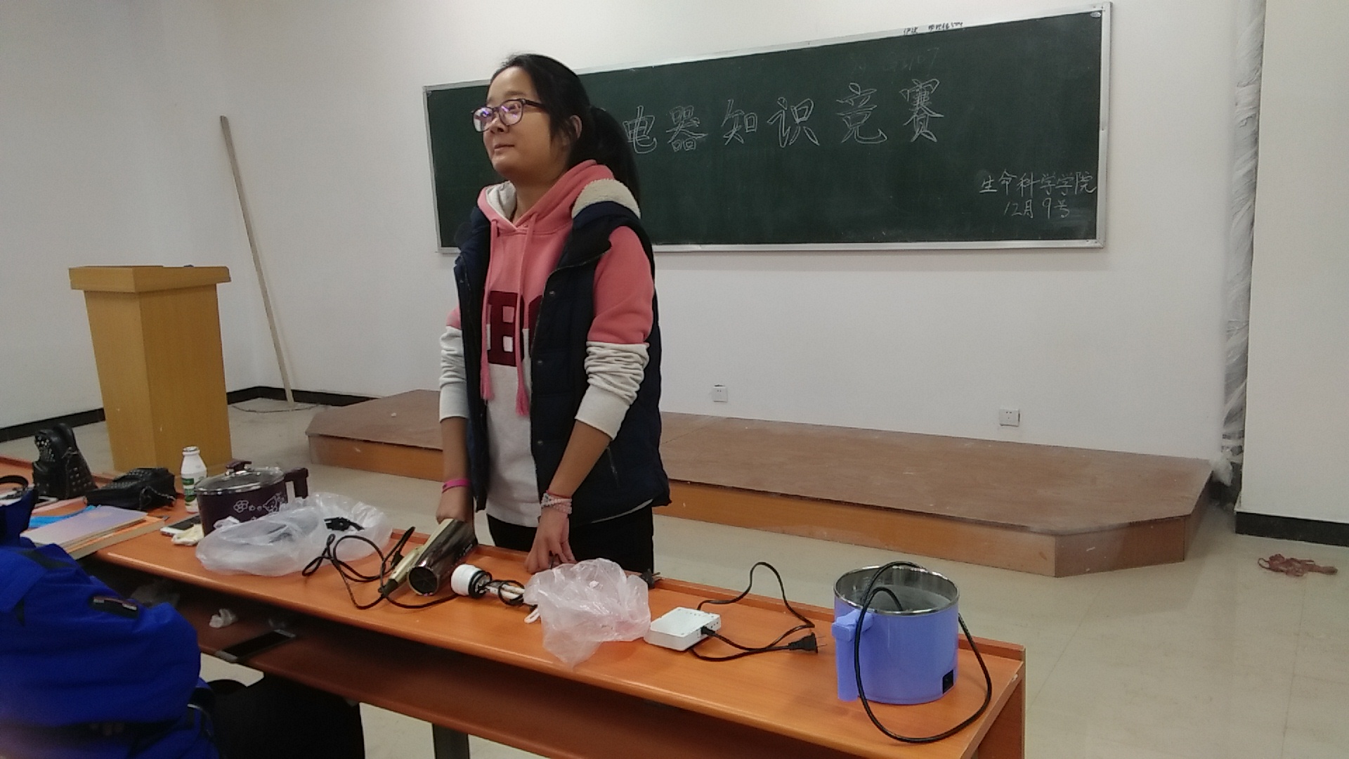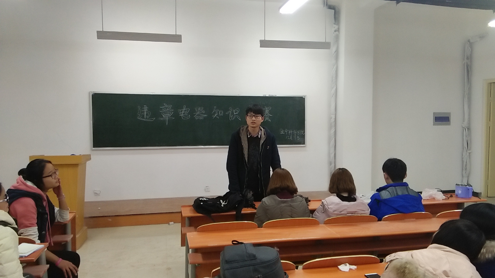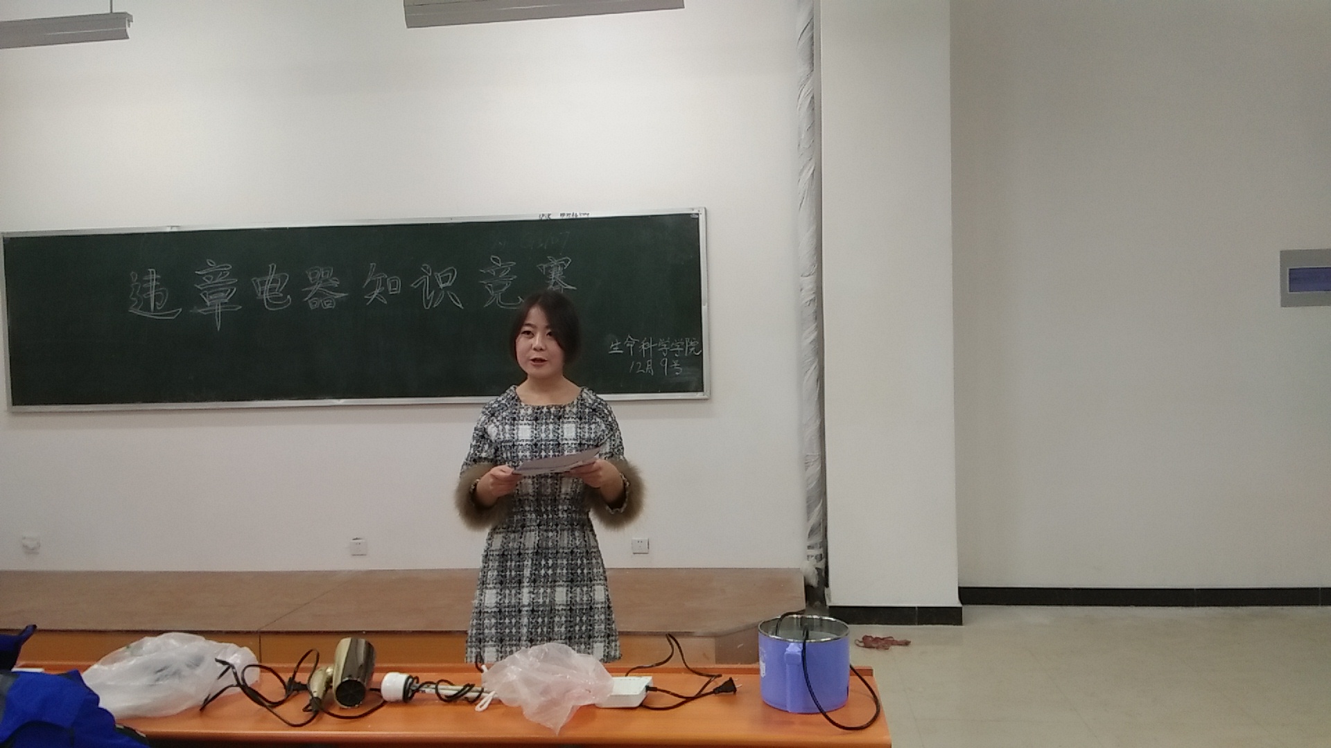 12月9日晚,由生命科学学院楼层管理部主办的违章电器知识竞赛在生命科学学院阶梯教室成功举办。参与对象为生命科学学院2014级和2015级的学生,同时邀请了学工助理团副团长田世雄、辅导员助理黄星辰、公寓管理部副部长黄池和生活权益部副部长刘雅担任此次竞赛的评委。