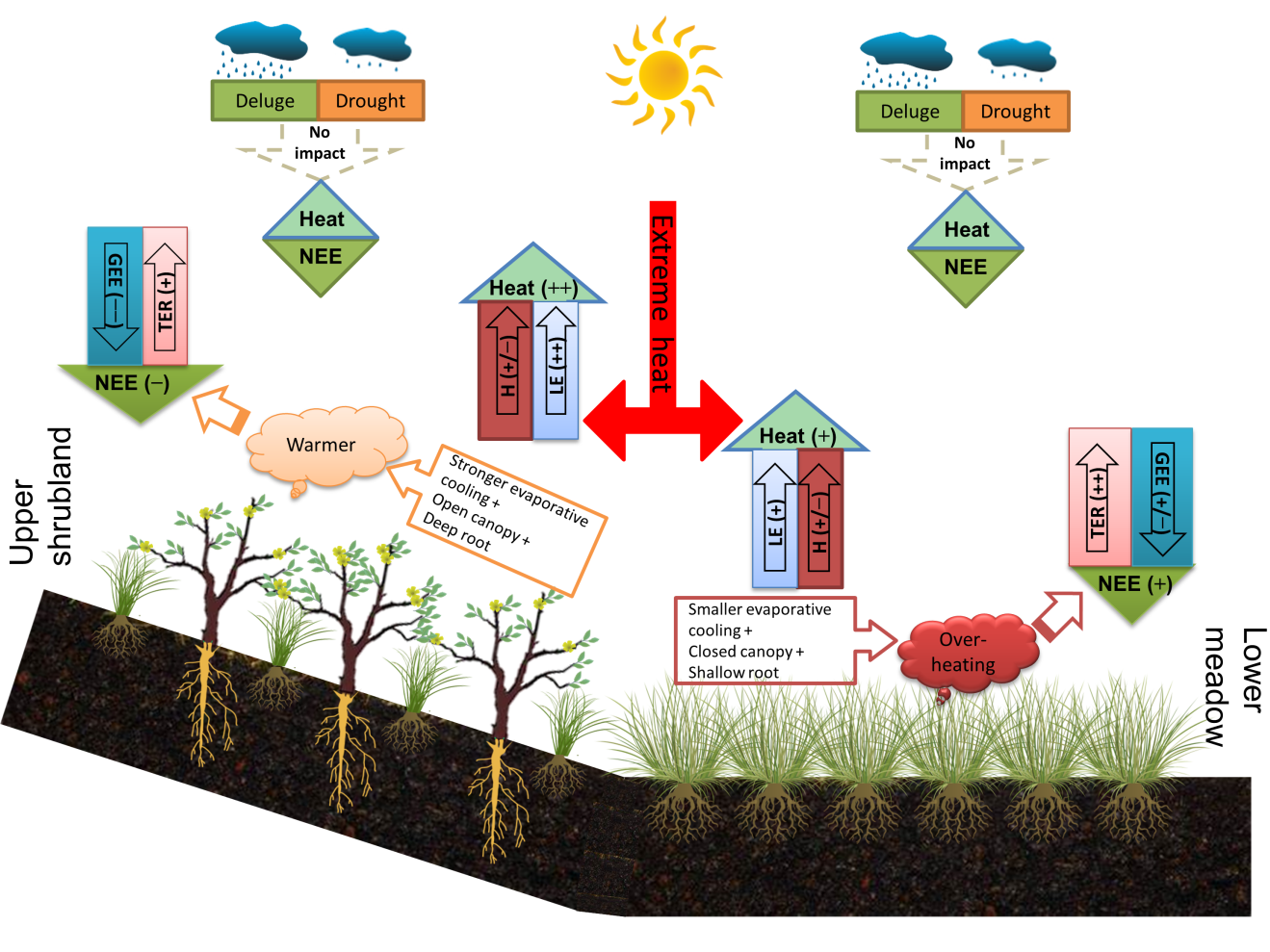 近日,我院陆地生态系统过程团队李红琴副教授基于涡度相关技术,对青藏高原东北部高寒草甸和相邻高寒灌丛的连续观测数据,配对比较了CO2通量和热量通量对极端气候事件的响应。在干旱和随后的复合干旱及高温期,高寒草甸和高寒灌丛的潜热通量(LE)分别提高了21.8%和56.4%。热量(潜热、显热)通量的变化均由太阳辐射的变化(△Swin)决定。但高寒灌丛由于其冠层相对稀疏和粗糙,其ΔLE和ΔSwin的敏感性更高,表现出更强的蒸发冷却能力以缓冲气候异常事件。但极端降水事件如果没有耦合高温事件的话,对高寒草地CO2通量的影响微弱。在单次或复合高温事件期间,两种高寒草地总生态系统呼吸(ΔTER)平均提高约30%,但相对高产的高寒草甸的ΔTER对表层土壤温度的变化具有较高的敏感性。高寒草甸的总初级生产力的平均变化幅度(ΔGPP)小于10%,而在更高海拔的高寒灌丛的ΔGPP则提高了29.3%,这可能是由于二者的冠层结构差异及其导致高温胁迫的程度不同。高寒草甸生态系统CO2净交换量的变化(ΔNEE)与其ΔTER显著相关,因此增加了55.8%,而高寒灌丛的主要受ΔGPP控制,所以减少了22.4%。总的来说,由于充足的土壤水分供应和低温生理限制,高寒草地生态系统能够抵御当前的极端降雨变化,但容易受到高温事件的影响。高寒草地CO2和热量通量的差异响应可能与冠层结构有关,即表现出一定的类型依赖性,研究结果响应有助于预测高寒草地的生态功能的演变趋势。