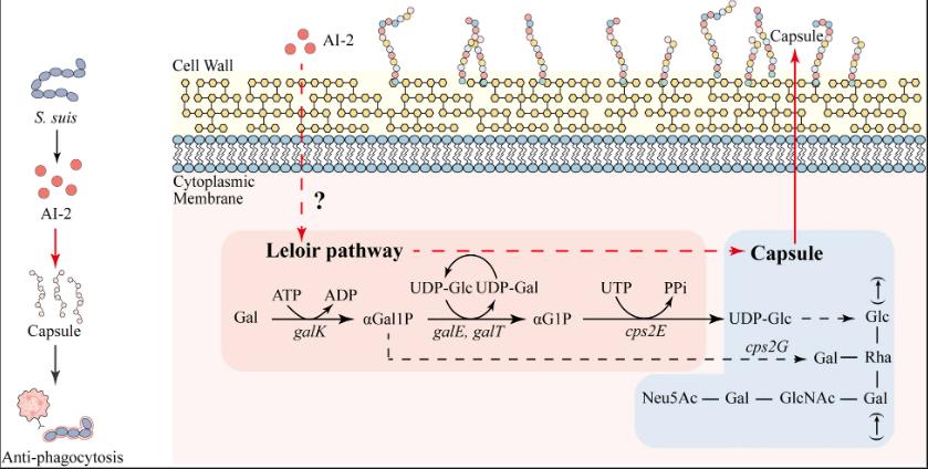 猪链球菌(Streptococcus suis, SS)是猪的重要致病菌,可以引起脑膜炎、败血症、心内膜炎、关节炎、肺炎等疾病,也可导致生猪从业人员感染和死亡。荚膜多糖(CPS)是促进猪链球菌侵入宿主细胞的关键毒力因子。细菌利用群体感应(QS)来协调基本细胞过程,适应环境变化,产生抗生素耐受性和增强毒力。LuxS/AI-2型密度感应系统是近年来发现的一种新型细菌群体感应机制,即由LuxS蛋白参与合成的AI-2型信号分子介导的种间群体感应,对细菌的各种生理过程起着至关重要的作用。然而,AI-2 QS调节猪链球菌CPS的具体机制尚不清楚。该团队证明了猪链球菌中AI-2 QS和CPS合成之间的潜在相互作用,通过感受AI-2信号分子来调节Leloir途径促进荚膜多糖前体产生,并促进CPS合成。此外,分子对接和动力学模拟表明,与肺炎链球菌相似,在革兰氏阳性病原体中普遍存在的果糖特异性磷酸烯醇丙酮酸磷酸转移酶系统FruA,也可能在猪链球菌中作为AI-2膜表面受体发挥作用。该研究为预防和控制猪链球菌感染提供理论依据。