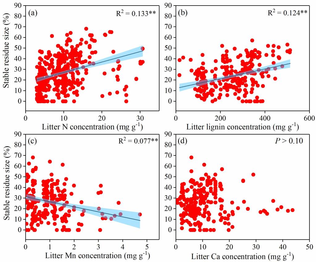 除了温度敏感性,凋落物分解极限是另一个决定陆地碳库和大气碳库之间碳流动速率的因素。我院陆地生态系统过程团队通过收集和整理已发表文献中的数据,发现叶凋落物初始氮、木质素和锰含量是控制分解极限的主要因素。该研究以“Global pattern and drivers of stable residue size from decomposing leaf litter”发表于农林科学类一区Top期刊Catena。