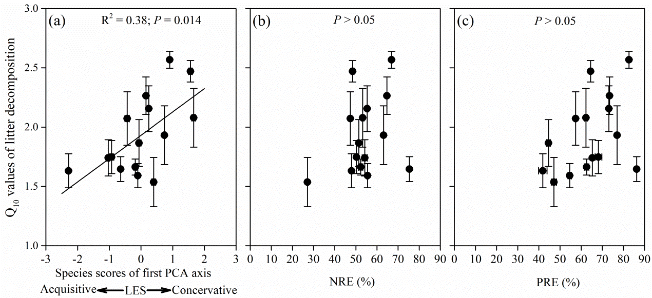 凋落物分解是生态系统碳循环的重要环节,其温度敏感性将对全球变化的进程产生深远影响。然而,凋落物分解温度敏感性与物种功能性状之间的关系还没有得到很好的理解。基于此,洛阳师范学院生命科学学院陆地生态系统过程团队以15种乔木叶凋落物为研究对象,采用实验室培养的方法研究了凋落物分解温度敏感性与物种经济型谱和养分回收策略之间的关系(图1),为预测凋落物分解速率对全球变暖的响应程度提供了一定的参考。该研究以“Leaf economics spectrum prevails over nutrient resorption in regulating the temperature sensitivity of litter decomposition in a subtropical forest ecosystem”为题发表于农林科学类一区Top期刊Biology and Fertility of Soils。