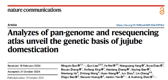 2024年10月29日,我院枣科研团队在Nature Communications(中科院1区,影响因子16)发表了题为Analyses of pan-genome and resequencing atlas unveil the genetic basis of jujube domestication的研究论文,该论文整合多组学、遗传学、分子生物学等多种实验手段系统解析了数个重要驯化性状变异的遗传基础。