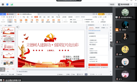 为深入学习宣传贯彻党的二十大精神,激励学院师生党员用习近平新时代中国特色社会主义思想武装头脑、指导实践、推动工作,大力弘扬伟大建党精神,扛牢立德树人根本任务,坚守为党育人、为国育才的初心使命,推动学习宣传贯彻党的二十大精神干在实处、走在前列,确保学校“两攻坚三大考”重点任务落实落细,12月10日,我院以线上方式组织开展“立德树人建新功﹐强国复兴竞出彩”微党课比赛。