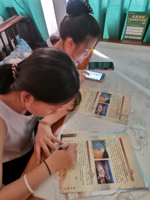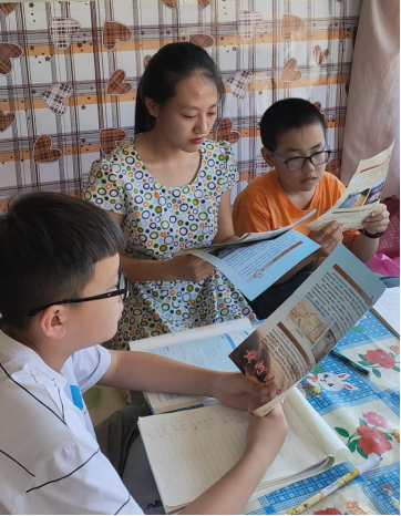 (武静在山西朔州怀仁市海北头乡下海子村为当地孩子讲解宣传册上有关黄河的知识)
