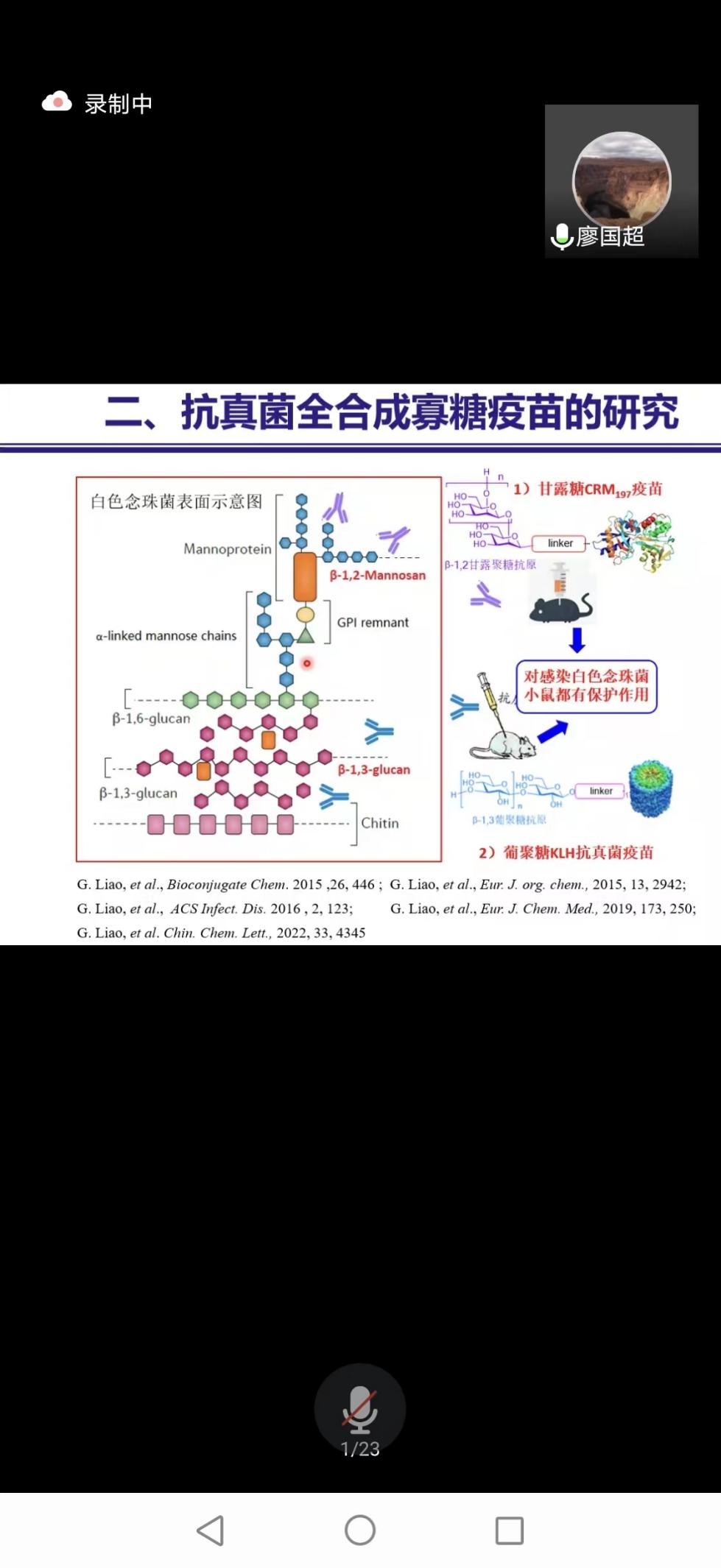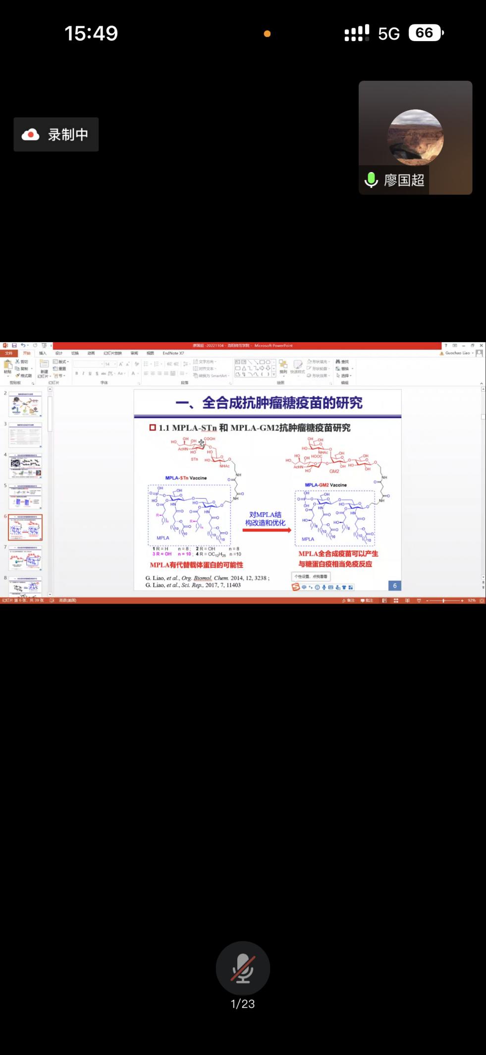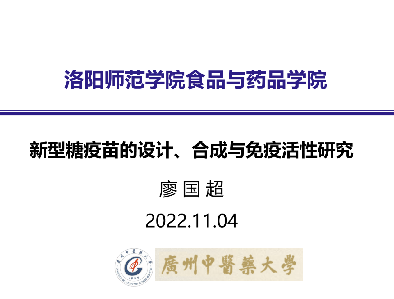 为加强学术交流和学科建设,11月4日下午15:00,广州中医药大学杏林青年学者,广东省珠江学者特聘教授廖国超博士应学院邀请,在线上(腾讯会议:808 623 709)开展了题为“新型糖疫苗的设计、合成与免疫活性研究”的学术报告。会议由院长刘献明教授主持,食品与药品学院、化学化工学院、其它高校学者等170余人参会。