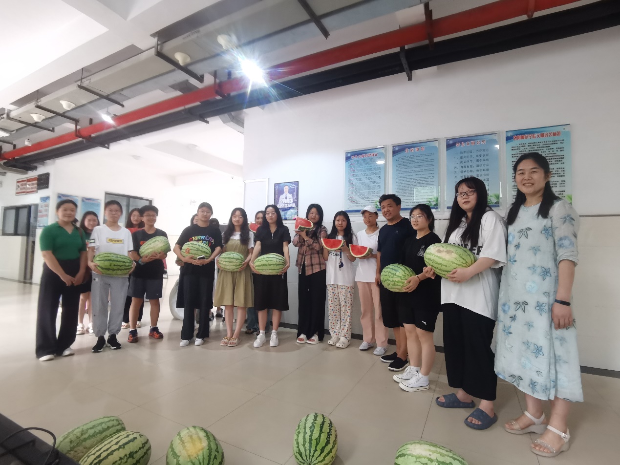 搬着沉甸甸的大西瓜,汗流浃背的陈书记亲切地对同学们说,“西瓜太大,你们抱不动,我可以先给你们都切开。”陈书记一边为学生切瓜、递瓜,一边问学生考研复习怎么样了?生活上一切顺利吧?学院始终是你们的坚强后盾,有困难第一时间向学院反馈。学院党委副书记蔡云改肯定了同学们在40℃高温下仍坚持作战的毅力,勉励同学们要迎难而上、坚持到底,叮嘱同学们留校期间注意安全,不晚归、不违纪,遵守暑期留校规定,有问题第一时间联系学院。
